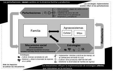 La resiliencia socioecológica se define como la capacidad de un sistema de permanecer, mantener y/o fortalecer sus funciones agroecosistémicas y el bienestar social después de someterse a alguna perturbación -como la disminución del precio de los productos, el ataque de plagas y enfermedades o los efectos de fenómenos meteorológicos-. Esto es posible a través de diferentes mecanismos que permiten el amortiguamiento de los impactos, también mediante respuestas de adaptación o transformación de la familia y su cafetal, como han propuesto otros autores para sistemas socioambientales (Walker et al., 2004; Biggs et al., 2015).
