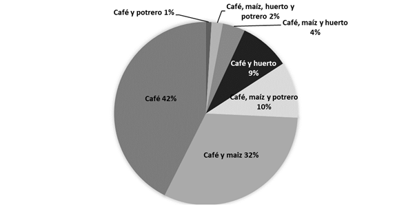 48 % de las familias posee parcelas para la producción de café y parcelas destinadas a la milpa (producción de maíz, frijol, calabaza, yuca, chiles, camote y otras especies de palmas, tubérculos, hierbas comestibles y frutales). La milpa representa un sustento importante de la alimentación, no obstante, un grupo importante (42%) de caficultores especializados no tiene milpa y satisface su demanda de maíz a través de la compra de productos básicos en la misma comunidad o en mercados regionales. Más de la mitad de los caficultores (58%) tiene tierras que destina para usos de suelo diferentes a la producción de café, entre ellos se encontró que las dedican a la producción de alimentos y ganadería, principalmente de traspatio (véase Figura 4).