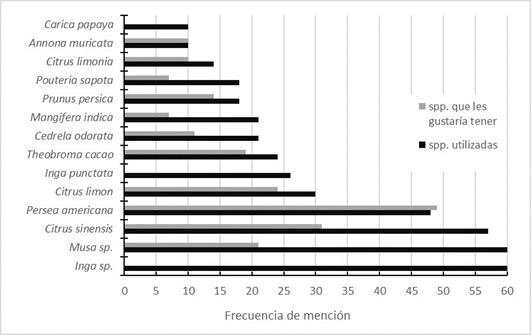 Asimismo, el aguacate (P. americana), la naranja (C. sinensis) y el limón (Citrus limon) son consideradas por los caficultores como especies preferidas porque pueden adaptarse dentro o fuera del cafetal (véase Figura 5). El manejo de la diversidad de especies en el cafetal es una práctica común entre los caficultores, quienes, por lo general, desean incrementar la diversidad de especies aprovechables, tal como lo muestra el siguiente testimonio: «queremos meterle árboles de aguacate en el cafetal, mango y otros árboles de fruta que nos puedan ayudar» (Caficultor, 64 años).