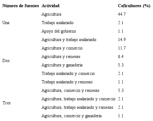 Podemos observar que 52.1 % de los entrevistados obtiene recursos económicos de dos o más fuentes de ingreso, entre las que destacan: la agricultura, el trabajo asalariado, el comercio (abarrotes), las remesas y la ganadería (véase Cuadro 1). De los productores que se dedican únicamente a la agricultura, 56 % vende otros productos agrícolas además del café.