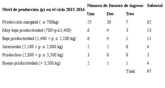 En el 43.6 % de familias, el ingreso no agrícola es un complemento, más que un sustituto; solo 6.4 % de caficultores no mencionan entre sus principales fuentes de ingreso la agricultura. 14.9 % de los caficultores señaló que una fuente importante de ingresos proviene de las remesas que reciben de familiares migrantes (véase Cuadro 1). Aunque las familias despliegan una diversidad de estrategias para complementar su ingreso, las tres principales fuentes que les aportan mayor retribución (véase Cuadro 1) no influyeron sobre los distintos niveles de producción del café durante el ciclo 2015-2016 (x2 = 7.9; P=0.63, véase Cuadro 2).