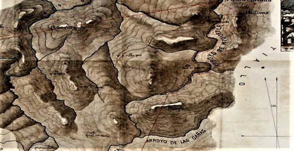 De manera similar al caso de Cuextlan, se encuentra el de Tetzapotitlan, o en específico, el de Teayo si se atiende primeramente a la etimología por encima de una inferencia que resulta errónea en Los Lienzos de Tuxpan, como ya se señaló. Para iniciar el cuestionamiento, es necesario considerar otros documentos históricos de la región, como el Croquis de los Terrenos de Metlaltoyuca (1883), donde se muestra un área ubicada al extremo oriental que ostenta la denominación «Tiallo» (véase Figura 7), correspondiente a un pueblo habitado en aquel entonces (Almaraz, 1866:26 ). Esta población, de acuerdo con Fages, correspondía a una ranchería de Tihuatlán, mencionada en otro documento de 1854 (Melgarejo, 1970:155 ).