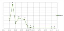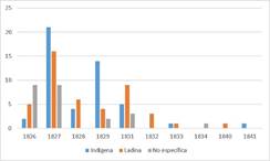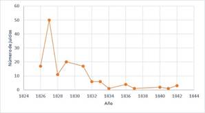 De estos 139 registros, en el primer año se realizaron 17 juicios, un año después el número se elevó a 50; en 1827 fue cuando se registró el mayor número de procesos. Un año después, se presentó una baja de 39 casos, habiendo un aumento en el siguiente año. Como podemos observar en la Gráfica 1, a partir de 1829 el número de juicios fue en disminución, a excepción del año 1836 cuando volvió a haber un ligero repunte. Durante el periodo centralista (1835-1842), los casos que se presentan son mucho menores, tan solo 11, en comparación con los de la República Federal (1824-1835) (véase Gráfica 1).