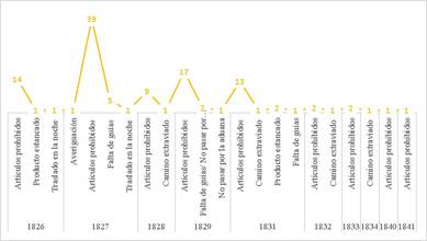 Los años con mayor número de casos fueron: 1827 con 46, 1829 con 20, 1831 con 17, 1826 con 16 y 1828 con 10. A partir de 1831 el número de casos sufre una caída con no más de tres casos por año, lo cual llama poderosamente la atención, como ya se mencionó, pues quizá fue por la inexistencia de un sistema de justicia en el estado. ¿A qué respondió que en 1835 no se realizaran comisos? Esto pudo deberse a dos factores: la crisis ocasionada por la epidemia de cólera que se desató en México en 1833,16 y la otra es la inestabilidad política provocada por la pugna entre facciones por el poder estatal.