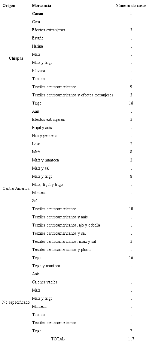 Los artículos prohibidos que se comerciaban eran maíz, trigo, frijol, anís, sal, manteca, loza, cera y los textiles centroamericanos (chamarros, naguas, mantas y jergas), así como los efectos extranjeros, que eran productos de exportación que estaban permitidos, en su mayoría, porque en México no se producían telas de la misma calidad. De ahí que estos efectos que caían en comiso eran por no contar con guías, por transitar de noche o por transportarse en camino extraviado. La siguiente tabla (Tabla 1) nos muestra el origen de los contrabandistas y la mercancía que transportaban.