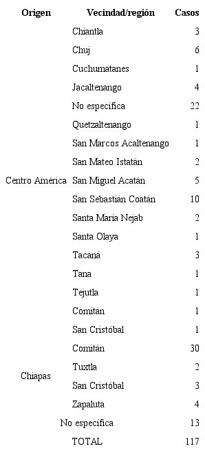 Se reunió a los contrabandistas por origen: chiapanecos, centroamericanos y no especificado. Este último campo aparece cuando no se registraba ningún dato de los comerciantes (nombre, vecindad, calidad étnica) o cuando los aprehensores de la mercancía reportaban haberla encontrado abandonada en algún paraje o camino.