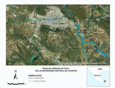 La caótica trama de la zona metropolitana actual se extiende desde Berriozábal, al oeste, abarca la porción norte del actual municipio de Tuxtla Gutiérrez (que a finales del siglo XX incorporó previamente a la independiente Terán) y se extiende al este, cruzando el cauce del río Grijalva hasta la moderna Chiapa de Corzo (véase figura 1). La masa urbana en esta zona ha formado una corteza de concreto y asfalto que cubre suelos, cárcavas, cuerpos de agua y ha desplazado la vegetación original. Asimismo, la ciudad ha invadido completamente la porción plana por donde todavía circula un contaminado río Sabinal, y lentamente asciende a las laderas de las mesas de Copoya, al sur, y Las Ánimas, al norte. Al este, las vegas del río Grijalva frente a Chiapa de Corzo presentan un ambiente semirural en vías de desaparición por la expansión de la mancha urbana y las ladrilleras. El oeste comprende el valle de Terán, que en su porción norte está completamente integrado a la ciudad, mientras que la porción sur se conecta con el valle de Suchiapa y es la zona donde, todavía, las actividades rurales son más comunes. Finalmente, la sección superior de la mesa de Copoya es también un área rural en acelerado proceso de urbanización.