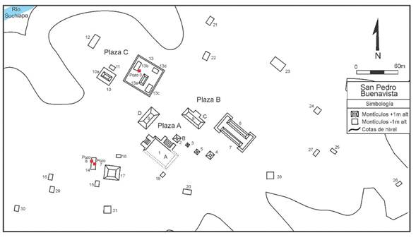 San Pedro Buenavista fue visitado y excavado por Heinrich Berlin (1946) y posteriormente visitado por Carlos Navarrete (1966). Estas exploraciones señalaron la presencia de nueve montículos y plataformas casi desaparecidas por la actividad agrícola. El montículo principal mide cuatro metros de altura y forma con los otros una plaza irregular, entre los cuales resaltan, por su tamaño, los restos de un juego de pelota, cuyos montículos alcanzaron una altura promedio de 1.60 metros. Se trata de un juego de pelota que presenta forma de “I”, y cuenta con cabezales que cierran ambos extremos de la cancha. Su presencia destaca la importancia de San Pedro Buenavista, ya que es la única cancha localizada en el área recorrida. Suponemos que existió otro juego de pelota en el valle de Tuxtla, pero los asentamientos estaban ya muy afectados cuando fueron registrados hace sesenta años. Aunado a los descubrimientos, Berlin realizó la liberación de una porción del Edificio A (véase figura 10), misma que reveló una compleja secuencia constructiva de escaleras con alfardas, que fueron cubiertas con estuco (Berlin, 1946). La presencia de estuco como aplanado de muros fue omitida en el reporte posterior de Navarrete, quien solo señala que algunas paredes estaban cubiertas de barro (Navarrete, 1966:119).
