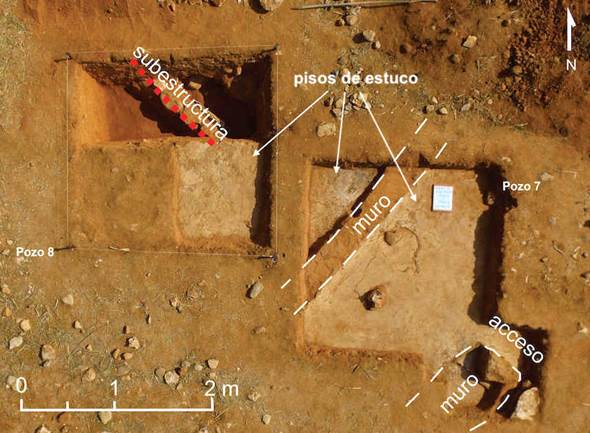 El pozo 8 se realizó directamente al oeste del pozo 7. En él localizamos la misma secuencia de pisos de barro y estuco, aunque más destruida por el paso del arado. Paradójicamente, la degradación del piso de estuco nos permitió retirarlo en la porción norte del pozo, para el cual se realizó un descenso de aproximadamente un metro de profundidad desde la superficie, donde se notaron más pisos de estuco y una subestructura con un muro de piedras no careadas (véase figura 11).