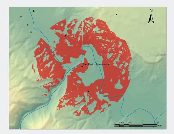 Asimismo, la información de la ubicación de los sitios arqueológicos fue estudiada por medio de Sistemas de Información Geográfica (SIG). El análisis permitió estimar el alcance del control visual de los sitios Mactumatzá, Cerro de la Borcelana y San Pedro Buenavista (véase figura 12) y constatar que tales poblaciones contaban con un amplio predominio visual de sus alrededores, lo cual permite sugerir que su posición en el paisaje cumplía un papel estratégico para el control de los movimientos de las personas, así como de las actividades o potenciales conflictos que se suscitaban en los poblados aledaños. Es notable destacar el impacto visual tanto de los monumentos apostados en la entrada de un formidable cañón (el caso del sitio de San Pedro), como el de la cima de la meseta de Mactumatzá. Dicho impacto no pasó desapercibido por las personas que circulaban, ya que ambas localidades son claramente percibidas desde circundantes a los valles de Suchiapa y de Tuxtla. Sin duda alguna, las ventajas del control visual, así como el carácter público ceremonial que les caracterizó, debieron constituirlos como nódulos de convergencia poblacional entre los valles. De igual forma, este interés por ubicarse en posiciones adecuadas para la vigilancia del territorio podría estar vinculado con intereses defensivos, considerando que los resultados del SIG son consistentes con las características que suelen mostrar sociedades aldeanas mesoamericanas con un alto interés por la defensa y el control territorial (Macías y Palacios, 2018).