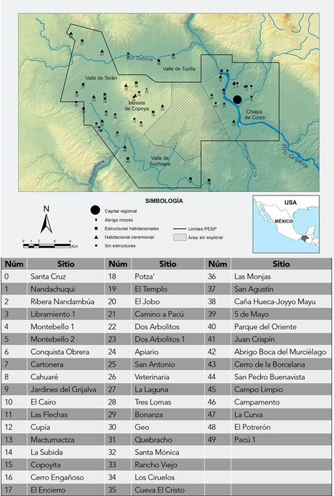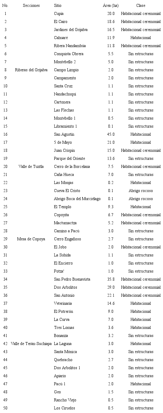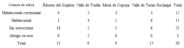 Hemos identificado cuatro clases de sitios arqueológicos que se distribuyen en este paisaje (véase Cuadro 2). Cabe mencionar que esta clasificación es un primer paso en el análisis del patrón de asentamientos en arqueología, al permitir diferenciar entre los aspectos funcionales y jerárquicos de los asentamientos antiguos (Montmollin, 1989:57-58 ). En primer lugar, los sitios sin estructuras son restos de asentamientos que se definieron por la presencia de cerámica y lítica en superficie, sin que fuera posible identificar la presencia de estructuras que representen a casas antiguas. En segundo lugar, los sitios habitacionales contienen restos de casas, identificables como montículos de cincuenta centímetros de altura en promedio y que en ocasiones se puede observar que están formados por muros de piedra. En tercer lugar, los sitios habitacionales-ceremoniales incluyen montículos de planta cuadrada o rectangular de más de un metro de alto, además de restos de casas. En estos sitios las estructuras ceremoniales y habitacionales se distribuyen en patios cuadrangulares o plazas. El sitio más grande es San Pedro Buenavista, en el valle de Terán-Suchiapa, el cual abarca también un juego de pelota. Finalmente, presentamos información relativa a los abrigos rocosos o cuevas ubicadas en la pared de la mesa de Copoya, los cuales al parecer tienen una larga ocupación y, durante el Postclásico, se utilizaron para fines principalmente rituales, una categoría funcional altamente especializada (Montmollin, 1989:57). La siguiente sección presenta características específicas de algunos sitios y su distribución en las cuatro regiones estudiadas.