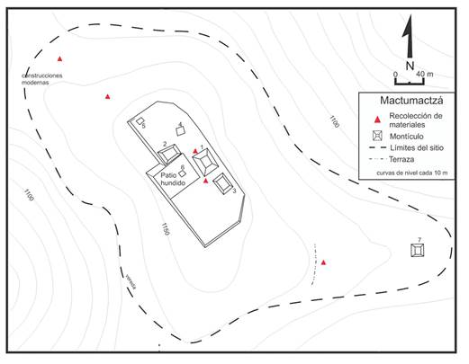 En primer lugar, la mesa de Copoya alcanza en promedio 850 metros sobre el nivel del mar, aproximadamente 300 metros sobre el nivel del valle de Tuxtla. La esquina noroeste de esta formación kárstica recibe tradicionalmente el nombre de Mactumatzá y alcanza los 1100 metros sobre el nivel del mar. En el punto más alto se identificó el sitio del mismo nombre, que ya había sido visitado a principios del siglo XX (Becerra, 1985:174 ). Desafortunadamente el sitio no fue incluido en los estudios arqueológicos posteriores, ya que no estuvo incluido en el recorrido de Lowe (1959:26) ni en el de Navarrete (1966). El sitio está formado por tres patios cuadrangulares, delimitados por estructuras de planta rectangular y 50 cm de altura en promedio. El edificio principal es un montículo de 3 metros de altura que en su lado norte presenta los restos de una excavación informal, quizá la realizada por Becerra (véase figura 5).