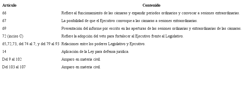 En los seis meses de la cátedra de Derecho Constitucional Mexicano hubo sesiones en las que su análisis fue escueto, como en los artículos 35, 40, 41, 55, 60, 61, 63, 120 y 122. Decidió no abordar otros por ser «temas repetidos» (artículos 74 y 78); por tener «redacción ambigua» (artículo 127); por «no parecerle necesario haberlo incluido en la Constitución» (artículo 134); o simplemente por «no tener nada que comentar» (artículos 128 y 129).