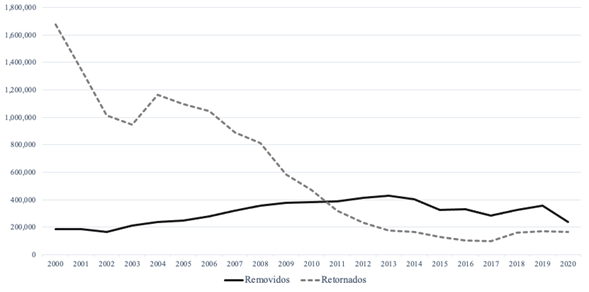 A la par de las iniciativas antiinmigrantes, la crisis económica internacional de 2008 tuvo importantes repercusiones para la dinámica migratoria México-Estados Unidos y dio inicio una nueva fase de reflujo migratorio en un contexto de crisis económica, social y política (Durand, 2013). En principio, se observa que más personas migrantes, consideradas «criminales», estaban siendo deportadas, muchas de ellas con varios años de estancia en aquel país. Esto como resultado del Consequence Delivery System, que imponía medidas más severas para castigar la migración irregular, con procesos de expulsión acompañados de consecuencias administrativas o penales (Capps, Hipsman y Meissner, 2017). Así, los eventos de migrantes expulsados observan un cambio de «retornos voluntarios», a una mayor presencia de eventos de población «removida»2 (ver Gráfica 1). Esto facilitado también por la política catch and release implementada por la patrulla fronteriza para remover —y no retornar— a la población que es detenida en su intento por cruzar la frontera de manera irregular.