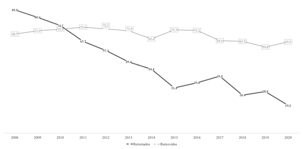 Del total de eventos de deportaciones voluntarias registradas de 2008 a 2019, la mayor proporción se registra en la población mexicana. A modo de ejemplo, de los 811 263 eventos de deportación voluntaria en 2008, 693 795 (85.5 %) corresponden a esta. Sin embargo, después de 2011 se observa una disminución sistemática en este concepto, con porcentajes de 57.3 en 2012 y 19.2 en 2020 (ver Gráfica 2).