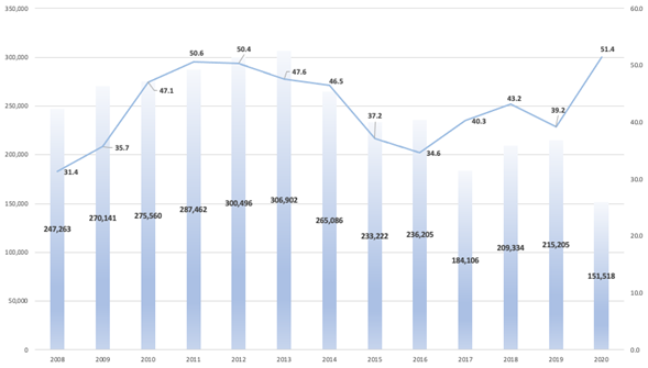 Cabe decir que dicha disminución responde a la tendencia ya mencionada, en tanto la proporción de eventos de remoción registró una tendencia al alza. Por ejemplo, del total de eventos de población removida en 2012, alrededor de 72.3 % fueron mexicanos, cifra que se mantuvo en proporciones semejantes hasta 2016, disminuyendo ligeramente de 2017 en adelante (ver Gráfica 2). Esta situación contribuyó al estigma asociado con el retorno de criminales, cuando en su mayoría se trata de personas que cometieron violaciones no graves a la ley de inmigración, y mucho menos delitos como asesinato, violación o secuestro (Thompson y Cohen, 2014 en Calva y Alarcón, 2018). Del total de eventos de población mexicana removida en ese periodo de tiempo, el porcentaje de los que regresan con estatus de criminal ha variado, aunque en 2020 alcanzó el valor más alto, con 51.4 % (ver Gráfica 3).