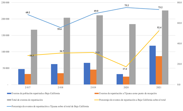 En un mayor nivel de especificidad, situándonos en la ciudad de Tijuana, las estadísticas de la Unidad de Política Migratoria permiten dimensionar la importancia que esta tiene como punto de recepción para los eventos de repatriación de mexicanos y mexicanas. Entre 2017 y 2019 alrededor de 30 % del total de eventos ocurría a Baja California, cifra que en 2021 alcanzó casi 53 %. De estos, durante el periodo 2017-2021, en la mayor parte de los años las proporciones se situaron por arriba del 68 % de los eventos en los que Tijuana se ubicó como el principal punto de recepción (ver Gráfica 4).