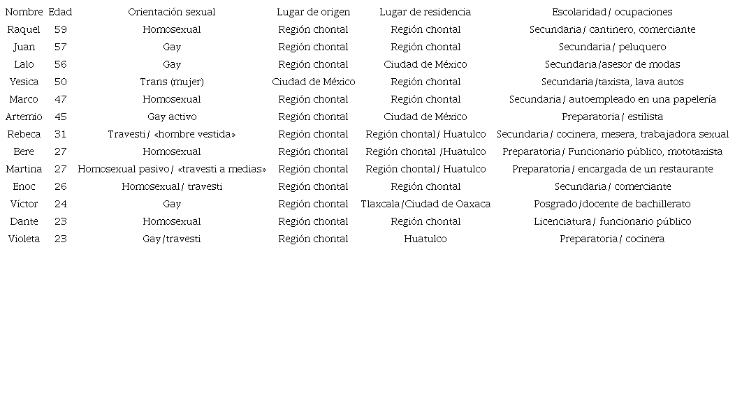 Estas personas de la diversidad sexual pertenecen a la región chontal de la costa en Oaxaca, quienes han migrado (aunque no se reconocen como migrantes), temporal o permanentemente, hacia cierto contexto urbano por alguna circunstancia relacionada con el trabajo, la educación o por motivos relacionados con su identidad sexogenérica (discriminación).14 Sus edades van desde los 23 hasta los 59 años. Para efectos del análisis se dividieron en dos grupos, de 45 a 59 años (seis) y de 23 a 31 años (siete). Del primer grupo emigraron principalmente hacia la Ciudad de México; de hecho, dos de ellos actualmente residen allá. Del grupo más joven, se han movilizado principalmente en el mismo estado (hacia Salina Cruz, Huatulco, Puerto Escondido y la ciudad de Oaxaca) y hacia entidades como Baja California Sur, Tlaxcala y Puebla.