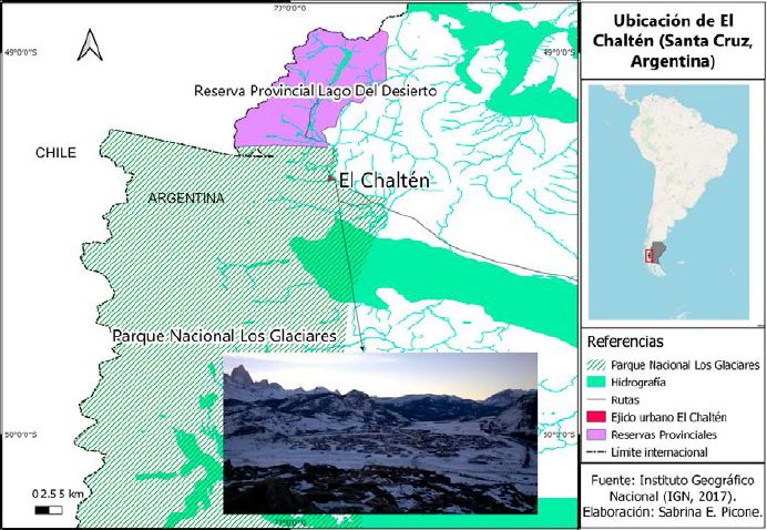 En particular, la localidad de El Chaltén se ubica aproximadamente a 220 kilómetros de El Calafate, al suroeste de la provincia de Santa Cruz (véase Figura 1). Su creación respondió a la necesidad de establecer población civil permanente en un área de frontera y de tensión con la República de Chile. Como el lugar elegido para el emplazamiento urbano se encontraba dentro del PNLG, fue necesaria la sanción de una ley nacional que desafectara el dominio de ese territorio a la provincia (Ley Nacional N° 23.766). El Chaltén nació así en jurisdicción del PNLG, dentro de la Reserva Nacional Viedma, como proveedor de servicios turísticos para los visitantes del área protegida. Actualmente su población asciende a 3000 personas2 y fue declarada Capital Nacional del Trekking en 2015 (Ley Nacional N° 27.055). Sus principales atractivos son los cordones de los cerros Chaltén (o Fitz Roy) y Torre. Localmente se han identificado problemáticas relacionadas con el crecimiento demográfico y con la creciente afluencia turística desde el año 2005. Entre ellas pueden mencionarse: conflictos por el acceso a la tierra y la vivienda, colapso de los servicios públicos (agua, saneamiento, electricidad y gestión de residuos sólidos), y erosión de sendas y áreas de uso público en la zona norte del PNLG.