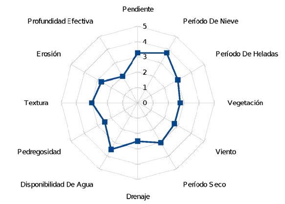 Los resultados de la valoración de la riqueza natural se presentan en la Figura 2. Se observa que los valores más bajos corresponden a: pedregosidad, drenaje y período de heladas. Estas variables indican condiciones edáficas no muy favorables para su formación y para el desarrollo de vegetación. Con base en el recorrido por el territorio, la valoración promedio para la riqueza natural es de 2.85.
