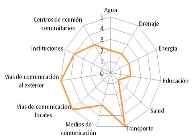Para la valoración de la riqueza física se realizan dos observaciones (Parra Vázquez et al., 2011): una interna (confeccionada en el taller participativo) y otra externa (efectuada por la facilitadora a partir de entrevistas a informantes clave y observación participante). Las variables de la riqueza física son: agua, drenaje, energía, educación, salud, transporte, medios de comunicación, vías (rutas) de comunicación locales, vías de comunicación al exterior, instituciones y centros de reunión comunitarios. La valoración interna se clasifica en bueno, regular y malo; la externa sigue los criterios de Parra Vázquez et al. (2011). Las observaciones se comparan; cuando la valoración interna es mala y la externa es buena se expresa una disonancia entre ambas observaciones. Por el contrario, si la interna es buena y la externa mala, se evidencia una adaptación. En los casos en que ambas observaciones coinciden con la valoración buena se determina una situación de bienestar. Por último, cuando ambas observaciones son valoradas como malas, existe una situación de malestar.