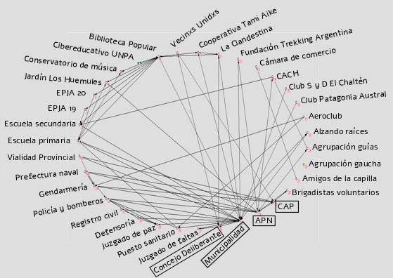 Se puede observar que la municipalidad, el Concejo Deliberante, la APN y el Consejo Agrario Provincial (CAP) (resaltados en la Figura 3) son las instituciones públicas que más interacciones presentan. Al ser mayormente relaciones unidireccionales, se identifica que estos organismos concentran las decisiones sobre qué proyectos se desarrollan en El Chaltén.