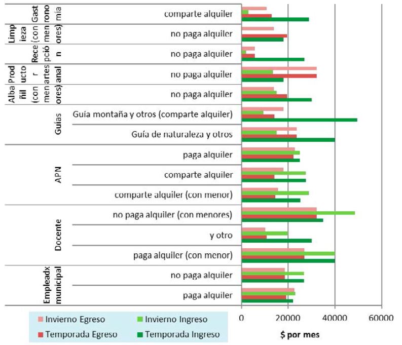 En lo que respecta a los balances, la Figura 6 muestra los ingresos (colores verdes) y egresos (colores rojos) en relación con la estacionalidad anual para cada ocupación laboral, la conformación del hogar (adultos y menores) y la situación de vivienda (si paga alquiler o no).
