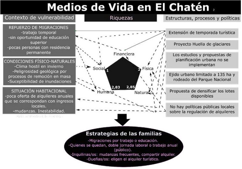 En este apartado relacionamos las riquezas con el contexto de vulnerabilidad, las políticas y las estrategias de las familias para identificar los medios de vida de El Chaltén. Los procesos y estructuras que forman parte del contexto de vulnerabilidad son: el clima, las migraciones y la situación habitacional.