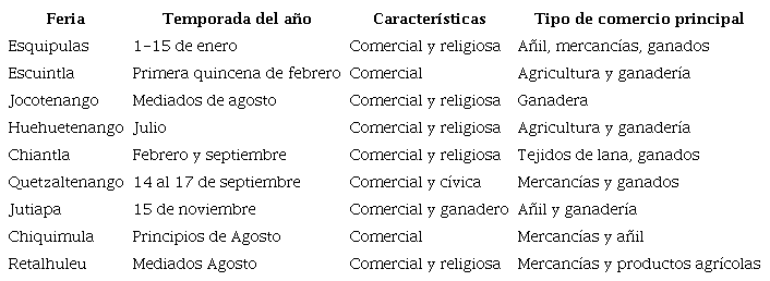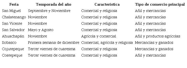 Las ferias comerciales pueden explicarse a partir de un problema histórico. La historiografía ha insistido en que su creación se debe al comercio de añil (Fernández, 2003; Lindo-Fuentes, 1995). Sin embargo, es necesario incorporar al menos dos variantes de análisis: una regional y otra social, que permitan entender las dinámicas productivas regionales y contextualizar las vocaciones económicas de cada territorio, en función de sus recursos naturales y su sociedad. Así se podrá observar cómo las economías locales, aparentemente periféricas, se articulaban con los centros principales, y entender cómo reaccionaban esos polos de producción y comercio en coyunturas concretas de inestabilidad política y social.