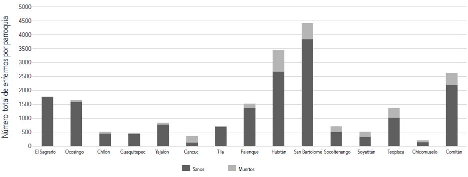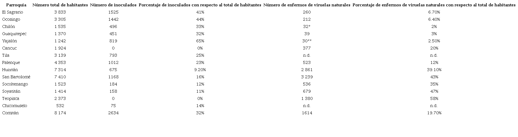 Todo apunta a que en aquellas parroquias en las que el número de variolizados fue alto, la cantidad de enfermos de «viruelas naturales» fue muy reducida. Por ejemplo, en la parroquia de El Sagrario, donde hubo 1 525 inoculados (41% de la población total), solo 260 personas (6.7% del total de habitantes) contrajeron la viruela epidémica. Por el contrario, en la parroquia de Socoltenango, en la que solo se inmunizó a 184 personas (12% de la población total), el número de casos de viruela natural ascendió a 536, lo que equivale a decir que 35% de los habitantes de ese curato se infectó. En este sentido, un último caso que nos permite ver con claridad el papel que jugó la inoculación en la prevención del contagio de la viruela natural es el de la parroquia de Teopisca. Por razones que desconocemos, ahí la inoculación no fue practicada, y el resultado fue que el virus causó estragos en 58% de sus habitantes (unas 1 380 personas).