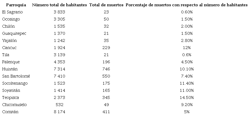 La documentación consultada también permite ver que la inoculación ayudó a aminorar el impacto demográfico de la epidemia (véase Cuadro 2). En las parroquias de Palenque, Ocosingo y Tila, donde la variolización fue practicada de forma más o menos extensa, la viruela natural mató a 4.3%, 1.5% y 0.6% de la población, respectivamente. Al contrario, en la parroquia de Cancuc las personas no fueron inmunizadas y este mal cobró la vida de 12% de sus habitantes.