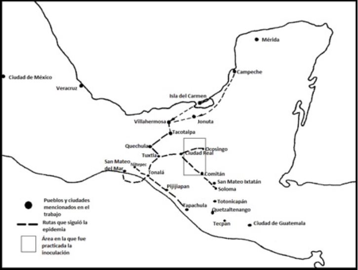 Ahora bien, desde 1790 llegaron a la Ciudad de México noticias de que en distintas partes de la Nueva España estaban apareciendo brotes de viruela. En particular, destacaron los informes que enviaron las autoridades de Campeche, Tabasco y Yucatán, en los que se dejaba ver que el número de contagios crecía de forma vertiginosa en esas provincias. Para 1793 comenzó a hablarse abiertamente de que en aquella parte del reino este mal había provocado una epidemia que no tardaría en extenderse a Tehuantepec y Guatemala (Cook, 1982: 298-300; Molina, 2008: 3-7).