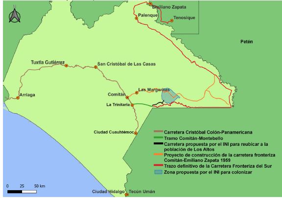 Al iniciar la segunda mitad del siglo XX la región fronteriza de la Selva Lacandona se encontraba aislada y deshabitada, lo que había provocado que personas de origen guatemalteco utilizaran la zona para contrabandear mercancías, y algunas incluso habían fundado rancherías. Por esta razón el Estado mexicano se preocupó por mejorar el control sobre ese territorio y así afirmar su soberanía sobre el mismo. De este modo, para finales de la década de 1950 se impulsaron proyectos para la frontera sur, entre los que destaca la construcción de un camino fronterizo que conectara las ciudades de Comitán con Emiliano Zapata, en Tabasco, pasando cerca de la frontera. La construcción de dicha carretera permitiría un mejor control del territorio, así como la puesta en marcha de otros proyectos ambiciosos, como el aprovechamiento de los ríos de la región para la construcción de presas hidroeléctricas que generarían la energía necesaria para impulsar la industrialización del país. Esto a su vez evitaría las inundaciones en Tabasco y al mismo tiempo se podrían crear distritos de riego para impulsar la agricultura y la ganadería en la zona.
