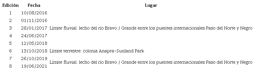 En este contexto, desde 2016 la Border Network for Human Rights (bnhr), una asociación civil de El Paso defensora de los derechos humanos, convoca «Abrazos, no muros». Hasta la fecha se ha celebrado en ocho ocasiones (a veces con una periodicidad anual y otras, bianual) en el límite entre El Paso y Ciudad Juárez, en dos localizaciones distintas (ver Tabla 1). Como se mostrará más adelante, aunque ambas localizaciones son cercanas, son muy diferentes en lo que respecta al terreno: en un lugar del límite fluvial (el río Bravo / Grande) y en otro del terrestre (entre Ciudad Juárez y Sunland Park).