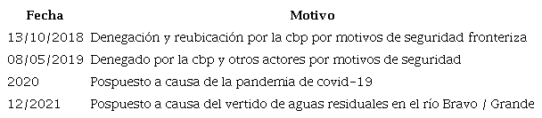 La fronterización de «Abrazos, no muros» empieza con la regulación misma de la concepción y organización de este evento, principalmente en lo que se refiere a la autorización para celebrarlo, el lugar de celebración y los participantes. En este sentido, el primer mecanismo impuesto por la cbp es la autorización previa, sujeta a un ensamblaje de múltiples regulaciones estadounidenses, entre las cuales se encuentran las de seguridad pública, salud pública y uso y ocupación de espacios públicos y privados, además de la propiamente fronteriza. No es este el lugar para precisar el procedimiento que la bnhr tiene que seguir, por lo no me detendré en ello. Sin embargo, conviene señalar que, para cada una de las ediciones, la bnhr ha tenido que solicitar autorización a la cbp y a otros organismos y dependencias públicas y privadas, y que la denegación ha conducido a la cancelación del evento en cuatro ocasiones por distintos motivos, entre los cuales se halla la seguridad fronteriza, pero no exclusivamente (ver Tabla 2). Así, por ejemplo, en 2019 a la bnhr se le requirió obtener también el permiso de una compañía ferroviaria, Union Pacific Railroad (up), propietaria de unas vías férreas que los participantes tenían que cruzar (como ya habían hecho previamente en 2018), y del departamento de policía local de Sunland Park. Primero, up denegó el permiso alegando motivos de seguridad de los participantes, ya que su presencia contravenía la prohibición de cruzar las vías salvo por los sitios habilitados y de reunirse en su propiedad salvo para empleados de la empresa. Segundo, a consecuencia del anterior, el departamento de policía no lo autorizó por no contar con el permiso de up; y, tercero, como consecuencia la cbp tampoco lo autorizó. A esta complejidad se suma la intervención indirecta de actores no-humanos, como virus (sars-CoV-2, causante del Covid-19), bacterias y residuos fecales. De su intervención derivan las recomendaciones de salud pública emitidas por las autoridades médicas de eua, en un caso, y por El Paso Water, empresa operadora del suministro y tratamiento de agua, en el otro.