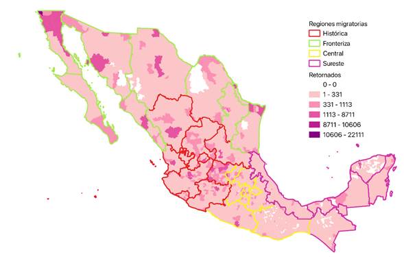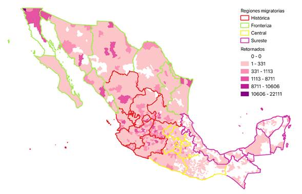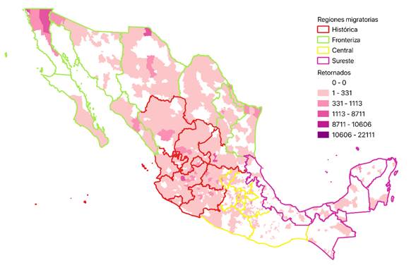 El tema del retorno, tratado a partir de la intensidad de su volumen y de la presencia espacial, fue un fenómeno incipiente en 1990, a pesar de que en aquella época la emigración estaba creciendo. En ese año, las regiones que presentaron un mayor número de retornos fueron la histórica y la fronteriza, mientras que en la central y la sureste no se registró un alto volumen de retornos, e incluso en la mayoría de los municipios de esas regiones no hubo presencia de retorno migratorio. Además de ello, cabe señalar que en ese año, aunque sí ocurrieron retornos, el volumen reportado no era considerable en comparación con los que se registraron en los censos de los años siguientes.