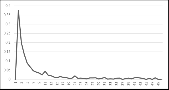 En la Gráfica 2 se interpreta el evento de retorno, en esta ocasión desde la perspectiva de riesgo de que le suceda el evento a la población de estudio. El mayor pico se encuentra, como se ha señalado, en los tres años posteriores a la migración; transcurrido este tiempo, los riesgos comienzan a decrecer. Es interesante observar cuándo suceden los siguientes picos: uno aparece a los 11 años, el siguiente a los 21 años y finalmente en las edades de retiro (lo que se ha llamado “efecto salmón”, es decir, las personas regresan a los lugares de origen a pasar sus últimos años de vida). Lo anterior muestra cómo cada individuo tiene un proyecto específico de migración en el que el retorno puede ser la conclusión.