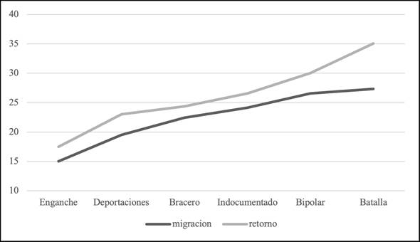 La Gráfica 3 ilustra las edades promedio de las personas que migraron y retornaron en cada uno de los ciclos migratorios. Como se puede observar, las brechas entre ambas curvas se amplían cuando el ciclo desfavorece la emigración; una primera lectura es que el tiempo de estancia, empatando las edades promedio, se alarga; sin embargo, una interpretación más admisible es que la mayor brecha se encuentra en el periodo de batalla, que coincide con el cambio de patrón que señala Durand (2016), ante una política migratoria persecutoria que dificulta la migración (véase Gráfico 3).