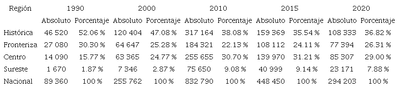En el año 2015 el retorno se desaceleró, lo cual pudo deberse a que muchos emigrantes mexicanos ya no pudieron llegar a Estados Unidos. El volumen de retornados cayó respecto a 2010, pero representó cerca del doble del registrado en el año 2010 (ver cuadro 1). Aunque la participación en volumen fue menor, la presencia espacial se mantuvo; la región histórica siguió encabezando la mayor aportación al fenómeno, seguida de las regiones centro, fronteriza y sureste. El año 2020 confirmó la tendencia que se observó en 2015, es decir, se produjo una desaceleración del retorno, aunque en términos absolutos el número de retornos fue mayor que los reportados en 1990 y 2000.