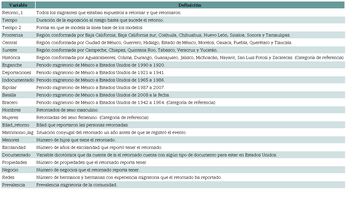 La palabra usada en el título de este trabajo y también en el de este apartado, determinantes, se usa en un sentido ambicioso, ya que algunos elementos que determinan el retorno de las personas mexicanas desde Estados Unidos son inmedibles y no susceptibles de procesarse en un modelo estadístico; sin embargo, sí serán consideradas como variables explicativas algunos elementos que la propia literatura ha señalado como relevantes para interpretar el retorno.