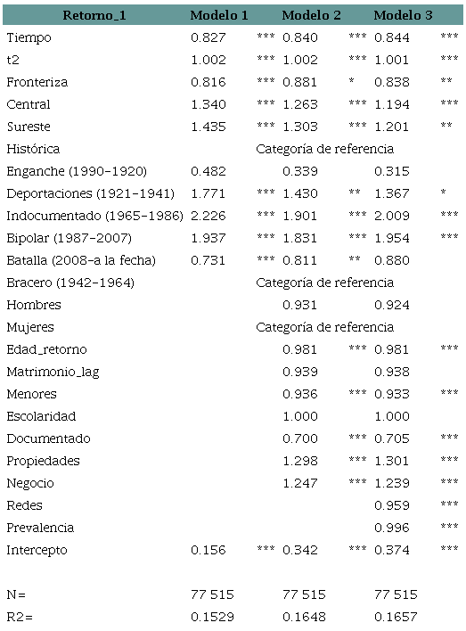 Para determinar los riesgos asociados a que el retorno se manifieste, en este trabajo se ha recurrido a las variables que se han propuesto en la literatura, lo que nos ha llevado a construir modelos anidados para evaluar tres aspectos: 1) ciclos y regiones migratorias, 2) características demográficas y económicas, y 3) redes migratorias.