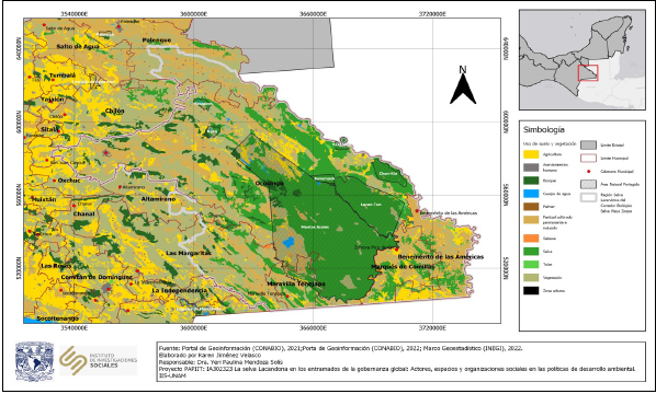En términos metodológicos, el estudio parte de un análisis cualitativo de corte antropológico en el que se recuperan indagaciones del trabajo de campo realizado durante los años 2022 y 2023 que incluyó observaciones etnográficas, entrevistas semiestructuradas y diálogos informales con actores sociales e institucionales de los municipios de Ocosingo, Las Margaritas, Maravilla Tenejapa y Marqués de Comillas, que participan en la gestión e implementación de programas de desarrollo en la selva Lacandona. Como parte de la investigación se realizó una revisión de la literatura clásica y contemporánea sobre política, desarrollo y organización social en la zona de estudio, lo cual se complementó con estudios que previamente he realizado en la región (Mendoza, 2016, 2022). Aunado a esto, se elaboró una revisión de información estadística, geográfica y ambiental a través del Instituto Nacional de Estadística y Geografía (INEGI) y la Comisión Nacional para el Conocimiento y Uso de la Biodiversidad (CONABIO).