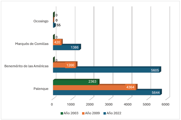 A inicios del siglo XXI comenzó la producción de palma africana en la selva Lacandona como parte de las políticas de reconversión productiva del sureste de México (Santacruz, Morales y Palacios, 2014) en el marco del desarrollo agroindustrial de la región. En un principio, este cultivo se estableció de forma experimental en la costa de Chiapas, y posteriormente se amplió su producción a 22 municipios del estado con apoyo de incentivos gubernamentales (García, 2017: 26). A principios del año 2000 la producción de palma africana en la selva Lacandona se concentraba prioritariamente en el municipio de Palenque. El cultivo comenzó a tener presencia en Marqués de Comillas y Benemérito de las Américas en los siguientes años, y posteriormente, en 2022, se registró en el municipio de Ocosingo la existencia de pequeñas áreas de producción (véase Gráfica 1). Durante las últimas dos décadas el área de cultivo de palma africana ha incrementado en la selva, lo que ha generado debates sobre las transformaciones sociopolíticas, económicas y culturales que han derivado de la introducción y el aumento de la producción agroindustrial de este producto (Cano, 2014, 2022, 2023; Castellanos-Navarrete y Jansen, 2017).