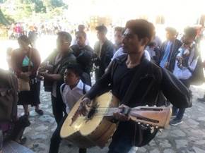 Otro dato importante es que en estas comunidades religiosas existe una participación muy activa de jóvenes, tanto hombres como mujeres, originarios de las localidades que integran esta red, quienes se congregan para participar en los eventos religiosos en el santuario de Pocolum. Principalmente, los jóvenes se organizan en grupos musicales de mariachi, en los que tocan instrumentos como la guitarra, la trompeta, el bandolón o el violín (véase Imagen 4). Cabe mencionar que estos jóvenes acuden al santuario para ensayar melodías católicas a lo largo de la semana, actividad que la Iglesia católica utiliza para involucrar a la población juvenil, captar nuevos fieles y, así, fortalecer la feligresía guadalupana en la región.
