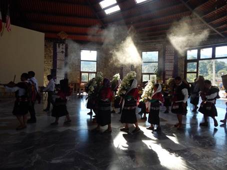 Si hoy llega a Yashanal y llega acá, mañana va a Shishintonil. Vienen temprano de allá, duerme, y al siguiente día, y así vienen pasando, hasta que se completa los treinta y seis parajes. Por eso, sale el 27 de octubre y todo noviembre, y el 1 de diciembre tiene que entrar la imagen a la iglesia. Ese día hay una misa y la celebración. En cada lugar donde pasa, a la virgen le hacen fiesta, bailando sin alcohol. Terminan en oración universal y los tres bailes juntos, terminan entonces, comienzan a recibir la comunión, termina eso y hacen la oración final (entrevista en Jerusalén, Tenejapa, 14 de mayo de 2023).