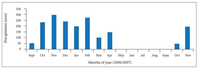 A field trial was carried out in São Desidério, Bahia, Brazil (12°S56’41”, 45°W58’47”, 840 m high), located in the Cerrado area of Brazil. The regional climate is Aw according to the Köppen classification, with a hot and humid summer and a dry winter; the mean annual temperature is 20 °C, and the annual precipitation is 1,500 mm. In addition, climate data were measured during experimental period (Fig. 1). The soil was classified as Typic Haplustox (Soil Survey Staff 2014). The experimental area was cropped for many years and soil fertility is enough to corn grown, promoting high potential to N fertilization mainly because low organic matter content. The soil is sandy loam with high potential of N leaching in soil profile. Results of the soil physical and chemical analysis are presented in Table 1.