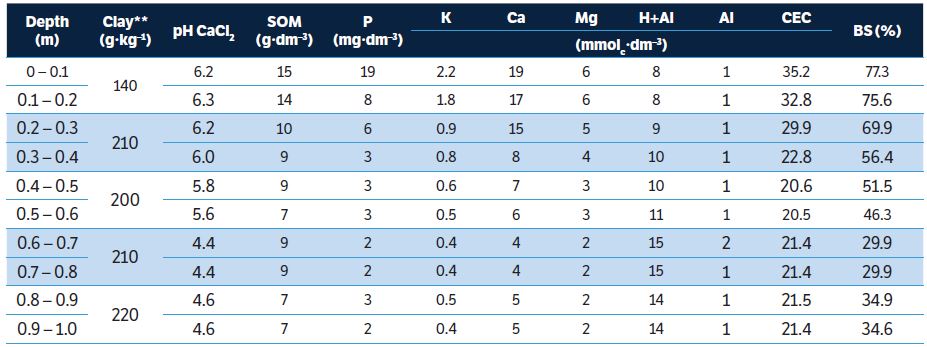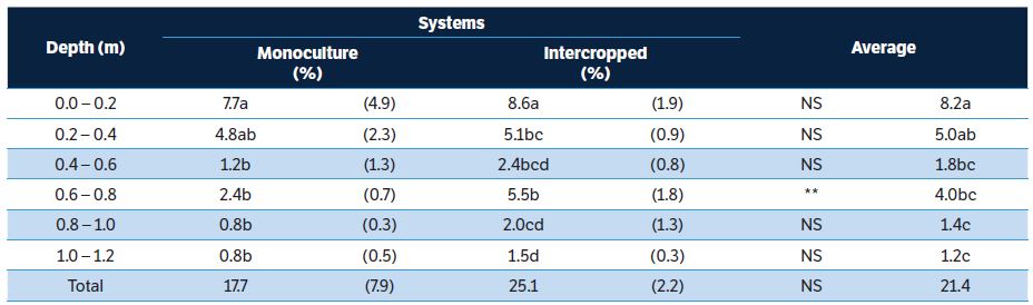 Results were submitted to analysis of variance (ANOVA). When the F-test showed significance in ANOVA (p < 0.05), means were compared by a t-test to differentiate systems (monoculture and intercropped). When applicable, a Tukey test (p < 0.05) was used to compare soil depths, using each soil layer like a treatment. Standard deviation was also presented (n = 4).