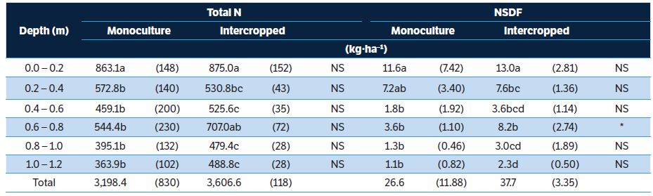 The total N in the soil was higher in the first 0.2 m, which represents 27% of the total N in the 1.2 m soil profile for monoculture and 24% for intercropped (Table 3). Similarly, the N in the soil derived from fertilizer (NSDF) was higher in the 0.2-m layer, with 11.6 kg∙ha–1N for monoculture and 13.0 kg∙ha–1N for intercropped. These amounts correspond to 44% (monoculture) and 34% (intercropped) of the NSDF accumulated in the 1.2-m soil profile (Table 3). The largest NSDF in the top 0.2 m of soil is a consequence of the fertilizer being applied at this depth and also of the increased immobilization of the fertilizer N by microorganisms in the soil surface.