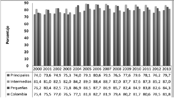Al analizar el coeficiente de localización geográfica del valor agregado del gobierno representando por la prestación de servicios de administración pública, se aprecia como ellos juegan un papel determinante en las economías pequeñas, al constituir en promedio el 22,3% de su PIB durante el periodo 2000-2013, mientras que en las economías principales su peso promedio fue de 7,8% y en las intermedias de 12,1%. Lo anterior responde a la mayor diversificación productiva propia de las regiones principales y a que el sector público en las pequeñas constituye uno de los principales dinamizadores de su demanda (Tabla 8).