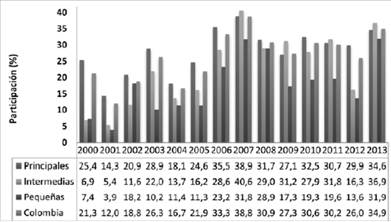 Con el propósito de facilitar el procesamiento y análisis de los datos departamentales (incluido Bogotá), las regiones se organizaron en una tríada jerárquica en la que cada grupo está conformado con igual número de integrantes de conformidad con la participación media que sus valores agregados presentaron durante el periodo de estudio (2000-2013)4, lo cual determinó la conformación de los siguientes conjuntos de departamentos que se denominarán en lo sucesivo grupos-región, así: